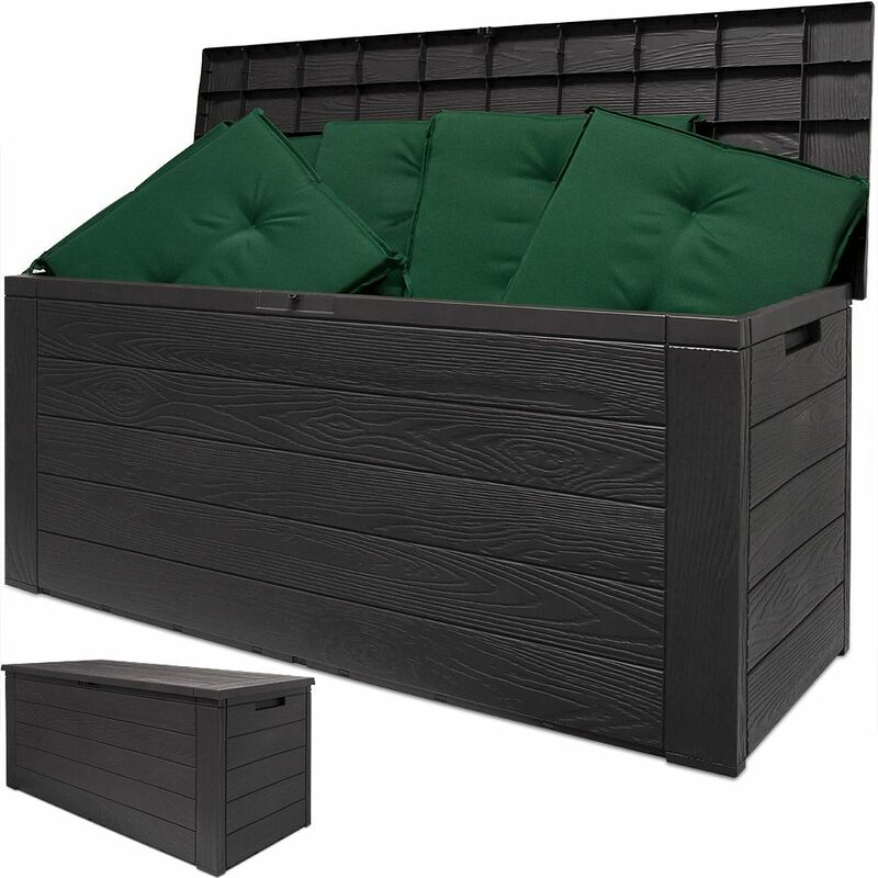 La scelta perfetta per il giardino!! Questo baule in plastica con effetto legno consente conservare diversi oggetti. È ideale come contenitore per cuscini e attrezzature da giardino. Il baule si può chiudere con il dispositivo di chiusura. Con maniglie per un trasporto facile. Vantaggi del prodotto: -Multiuso -Consente conservare oggetti da giardino -Si può chiudere. Possibilità di chiusura con lucchetto (il lucchetto non è incluso) -Adatto per terrazza, balcone e giardino Dati tecnici: -Dimensione: Lunghezza 120cm, profondità 46, altezza 57/ interno: 116 x43 x54 -Materiale: plastica -Colore: antracite-marrone ATTENZIONE: Il baule multiuso NON è per sedersi!! -1x Baule multiuso -La decorazione non è inclusa...Per saperne di più