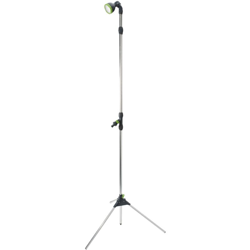 Tubo in alluminio rimovibile e regolabile in altezza. Il rubinetto si collega a un semplice tubo da giardino. Valvola on/off. Soffione regolabile. Le punte a spillo del treppiede permettono di conficcarlo leggermente nel terreno per stabilizzarlo....Per saperne di più