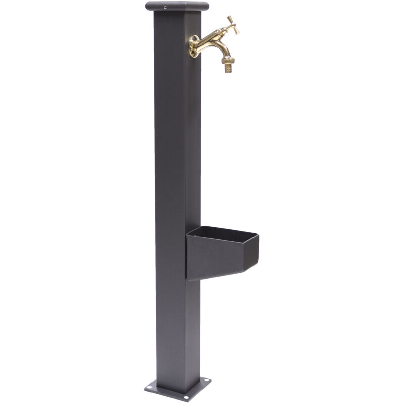 Fontana Itaca con rubinetto in ottone lucido. Fontana a colonna in acciaio zincato e verniciato a polvere epossidica antracite mod. Itaca con rubinetto cod. 303 in ottone lucido. Pratica e di facile montaggio mediante flangia forata ai quattro angoli. Misure: Altezza totale 90 cm Altezza rubinetto 82 cm Colonna 8x8 cm Flangia di fissaggio 12x12 cm Sporgenza 10 cm Misure vaschetta: Larghezza 8,5 cm Profondità 14,7 cm Altezza da terra 40 cm La fontana viene venduta senza impianto idraulico interno....Per saperne di più