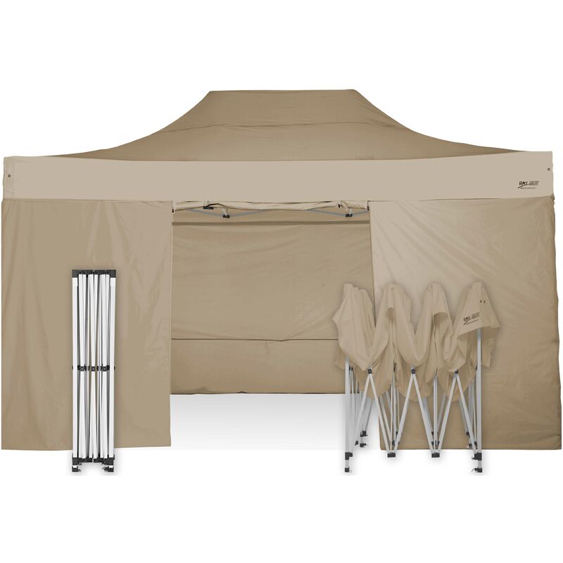 www.gazeboraybot.it GAZEBO PIEGHEVOLE NUOVO MODELLO RAY BOT 40mm 3X4,5 COMPRENSIVO DEI TELI LATERALI ROBUSTO E STABILE PER CHI FA MERCATINI ARTIGIANALI O VUOLE UN GAZEBO SOLIDO IN GIARDINO Unico nel suo genere per uso anche professionale. Gestione di ogni pezzo di ricambio!! Il gazebo pieghevole Ray Bot con cupola a punta è dotato di una struttura in acciaio RINFORZATO placcato antiruggine (colore struttura antracite o chiara a seconda della disponibilità) con gambe regolabili in altezza variabile da 1.5/2.10 - 3.50m. La struttura in acciaio è molto più resistente delle normali strutture in alluminio che, a causa dei loro spessori molto esili, tendono a piegarsi e spezzarsi soprattutto con venti o mediante utilizzo. L'uso della struttura in acciaio è ideale per chi ne fa uso professionale e soprattutto per chi intende dotarsi di una struttura che perduri nel tempo. La struttura in acciaio presenta, infatti una decisa maggiore resistenza a vento, pioggia e intemperie soprattutto forti...Per saperne di più