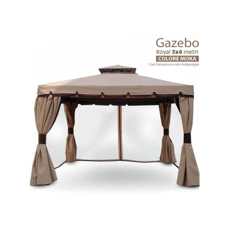 Spendido Gazebo da giardino con zanzariera e telo antipioggia. Il modello ROYAL e uno tra i pi๠belli in circolazione grazie alla sua forma pagoda, avrai la sensazione di stare in un posto esotico. Ideale anche per terrazzi, feste e barbeque all'aperto, meeting, bar, ristoranti, catering e cerimonie. Struttura in alluminio e ha una dimensione di 3 x 4 metri di colore Moka. Colore dei teli e Top Superiore Ecru' con balza Marrone. SPECIFICHE PRODOTTO: Tipo: Gazebo Modello: Royal Materiale: Struttura in alluminio verniciato a polvere Palo: Diametro 80 mm Telo di copertura: 300 gr mq Colore: Moka Dimensioni: 3 x 4 metri Ideale per: terrazzi, feste e barbeque all'aperto, meeting, bar, ristoranti, catering e cerimonie, feste e barbeque all'aperto. Montaggio facile CONTENUTO DELLA CONFEZIONE: 1 x Gazebo 3x4 metri Royal con Teli e zanzariera 1 x Manuale per il montaggio...Per saperne di più