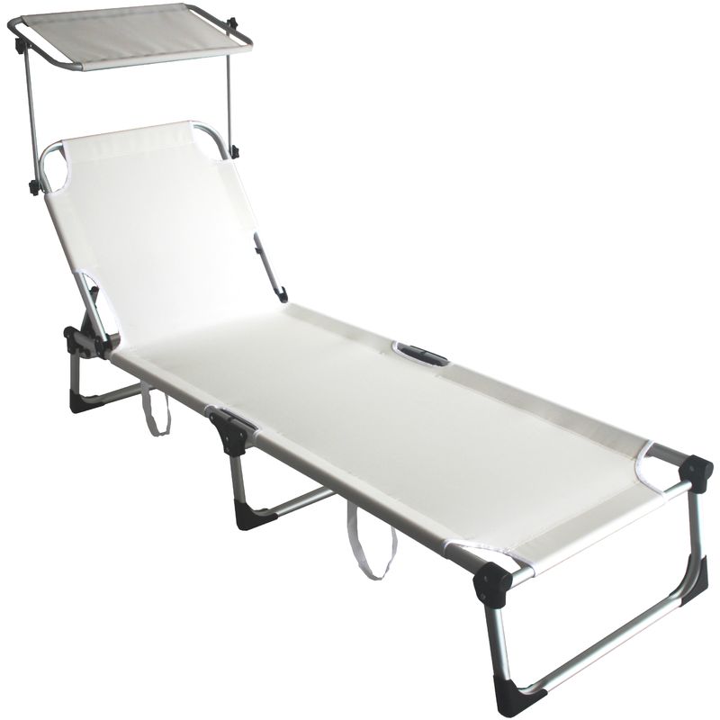 Lettino pieghevole Mykonos Bianco, struttura pieghevole in alluminio con copertura in textilene 2x1 con tettuccio parasole. Dimensioni del prodotto: cm 196x58x25...Per saperne di più