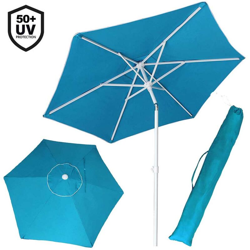 Goditi il massimo del relax al mare o in giardino con questo nuovissimo ombrellone da spiaggia! Questo bellissimo ombrellone da spiaggia ha un diametro di apertura di ben 210 cm ed è fornito di una solida struttura a 6 rami con palo spessorato da 32mm realizzati interamente in acciaio inox verniciato a polvere in colore bianco, la struttura inoltre è rinforzata da rivetti in acciaio che conferiscono a quest'ultima maggiore robustezza e durata nel tempo. Il palo infine è dotato di inclinatura regolabile che permette di dirigere l'ombra secondo le proprie esigenze. Il Telo di copertura è realizzato in tessuto poliestere 180gr con trattamento UV50+ che garantisce una protezione totale dai raggi UV del sole, la parte superiore è fornita di prese d'aria che impediscono accumuli di calore ed evitano che l'ombrellone voli via in caso di forti venti.. Design semplice e minimale in un bellissimo colore azzurro, questo ombrellone è perfetto per la spiaggia, per il giardino e per qualsiasi...Per saperne di più