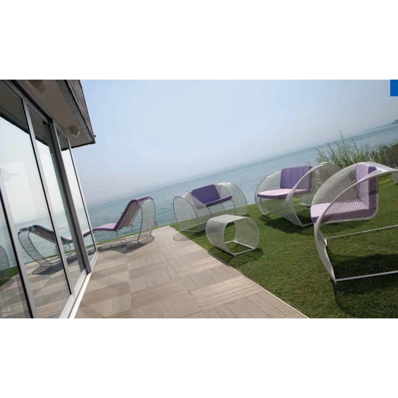 Salotto Mercury con cuscini formato da 2 poltrone, 1 divano, 1 tavolo rettangolare con base in rete stirata e top in vetro; poltrona con cuscini misure cm 132x99x83 h; Divano con cuscino miusure cm 196x99x83 h; tavolo rettangolare misure cm 92x50x48h....Per saperne di più
