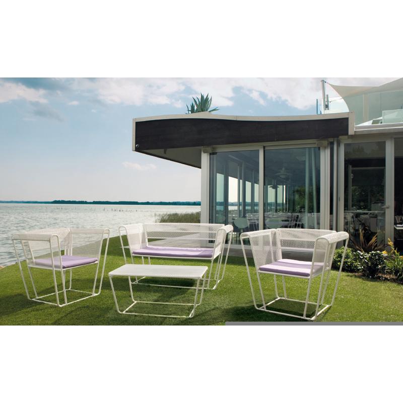 Salotto Royal con cuscini formato da 2 poltrone, 1 divano, 1 tavolo rettangolare con top in rete stirata; poltrona con cuscini misure cm 94x68x86 h; Divano con cuscino misure cm 155x68x86 h; tavolo rettangolare misure cm 100x55x45 h....Per saperne di più