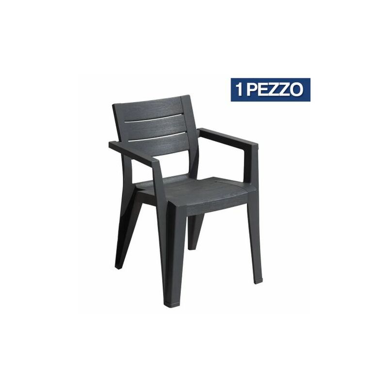SEDIA POLTRONA DA GIARDINO KETER La nuova linea di Keter per l'arredo esterno propone sedie con braccioli modello JULIE, per una seduta comoda senza rinunciare all'eleganza delle forme. La resina e nello specifico la resina in polipropilene, rendono i set arredo da giardino per esterno davvero pratici, resistenti a tutte le intemperie e ai raggi UV, facili da pulire, leggeri e dalle forme eleganti. Non richiedono nessuna manutenzione e ben si sposano in qualsiasi ambiente. SEDIA JULIE: misura 61,5 x 58,5 x 79 - Altezza seduta 45 cm - altezza braccioli 64 cm Colore: Graphite...Per saperne di più