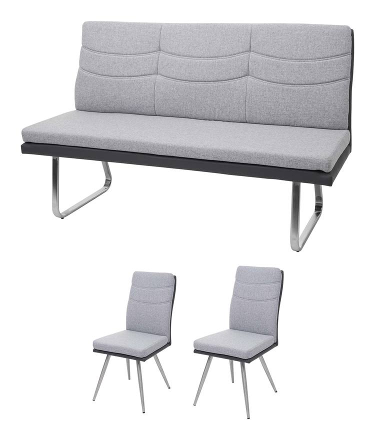 Set 2x sedie senza braccioli e panca da interni 180cm HWC-G54 acciaio inox tessuto ecopelle grigio - MENDLER