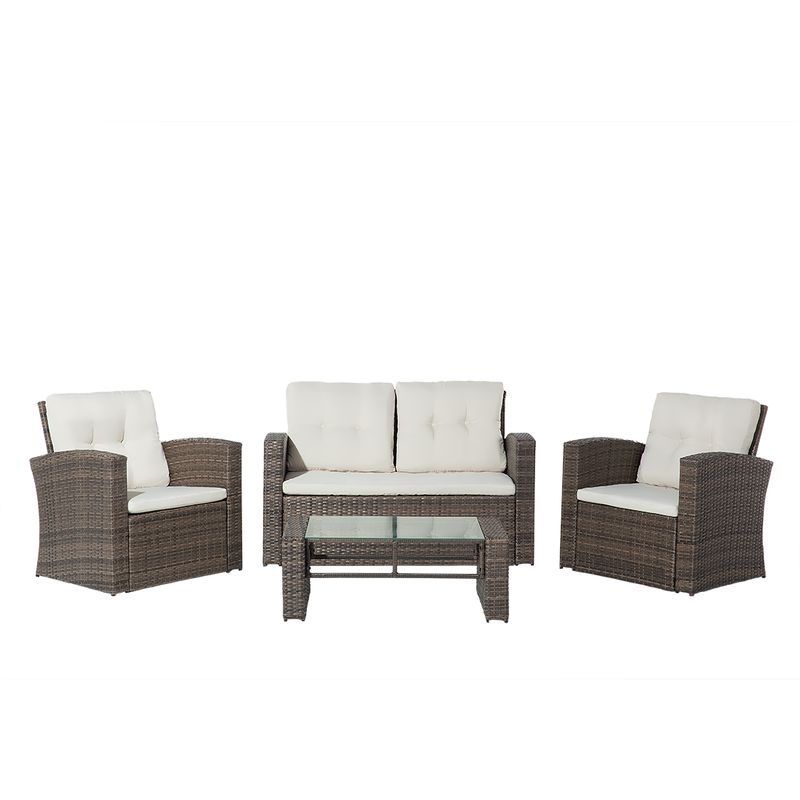 Set da esterno da 4 posti in rattan - Set da giardino chic in polirattan di color marrone scuro comprende una panchina 2 posti, due sedie e un tavolo - Dimensioni: divano - 61 x 128 x 77 cm , poltrone - ciascuna 61 x 70 x 77 cm, tavolo - 50 x 90 x 33 cm - Comodo arredo caratterizzato dalla struttura in acciaio inossidabile e poggiabraccia ricurvi - Cuscini abbinati (4 da schienale e 4 da seduta) di colore beige, spessi 5 cm, fatto in poliestere. Federe rimovibili e lavabili in lavatrice - Set da giardino dal design classico costruito in materiali eccezionalmente resistenti Dettagli: Tipo: Set da esterno Colore: marrone Materiale primario: Polirattan Materiale secondario: vetro temperato, poliestere, acciaio Montaggio: da assemblare Posti a sedere per: 4 persone Punti di forza: Massimo comfort, Costruzione precisa nei dettagli, Resistenza UV 4 (ISO 105-A02), Design moderno ed elegante, Cuscini sfoderabili Dimensioni: Peso: 54 kg Tavolo: 50x90x33 cm L'offerta include: 1 x divano 2...Per saperne di più