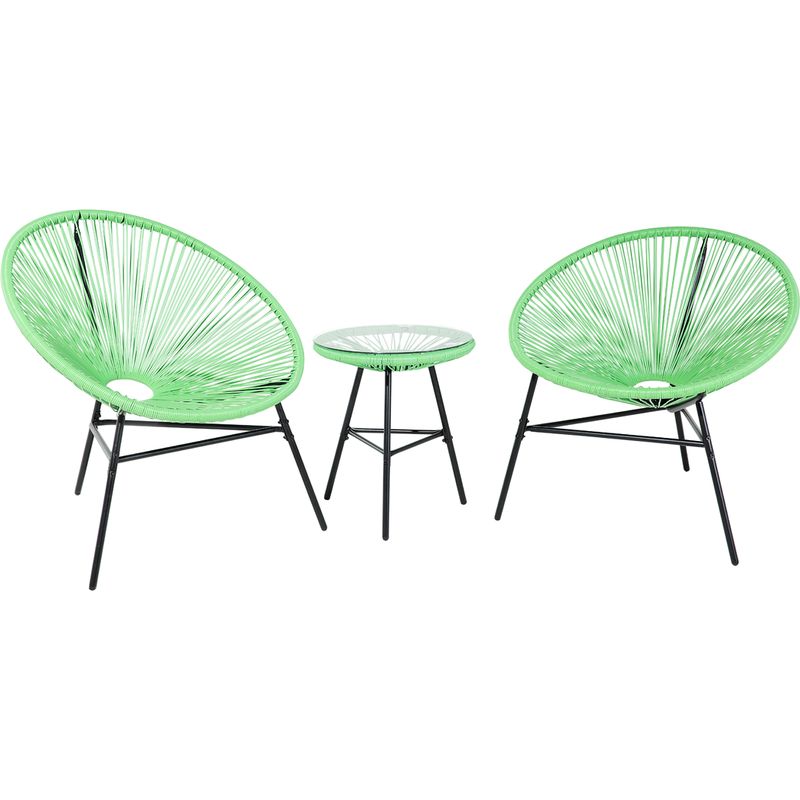 Set moderno di poltrone e tavolino da caffè con piano in vetro - Set moderno e funzionale che comprende un tavolino e 2 sedie - Il tavolo di dimensioni di 45x45x51 presenta un piano in vetro con ventose - La sedia di dimensioni 80x76x85 cm con un sedile di dimensioni 90x76 costruito in poliuretano profondità della seduta: 47 cm, altezza dello schienale: 49 cm - Costruito per resistere a lungo e perfetto anche per l'interno - Montato in pochissimi minuti e molto robusto Dettagli: Tipo: Set di tavolino e sedie Colore: verde Materiale primario: poliuretano Materiale secondario: vetro temperato, acciaio Montaggio: da assemblare Posti a sedere per: 2 persone Portata massima: 130 Punti di forza: Seduta bassa e profonda, Robuste gambe per massima stabilità, Piano in vetro di sicurezza, Gommini protettivi sotto alle gambe, Il piano del tavolo è fissato con ventose per evitare scivolamenti, Sia per interno che esterno Dimensioni: Peso: 13 kg Sedia/poltrona: 76x76x85 cm Tavolo: 43x50 cm...Per saperne di più