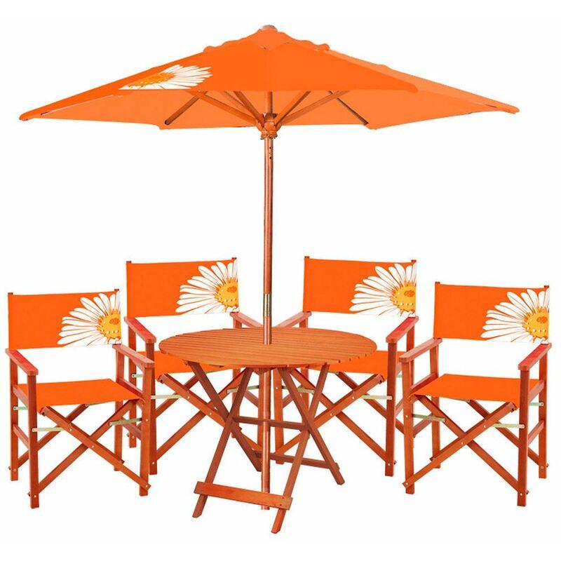 Set estivo dalle stampe hawaiane colore arancione composto da tavolo rotondo, 4 sedie e ombrellone. Tutto realizzato in legno. Unisce praticità e funzionalità del set interamente pieghevole alla robustezza del legno. Ideale come arredo dei tuoi spazi all'aperto, dona un tocco di allegria e colore all'estate. Caratteristiche Tecniche: Materiale struttura: legno 25 mm Dimensione tavolo diametro 70 cm Dimensione sedie (LxPxH): 46x56x87 cm Dimensione ombrellone rotondo (DxH): 200x220 cm Confezione composta da 3 colli: Peso 33 kg...Per saperne di più