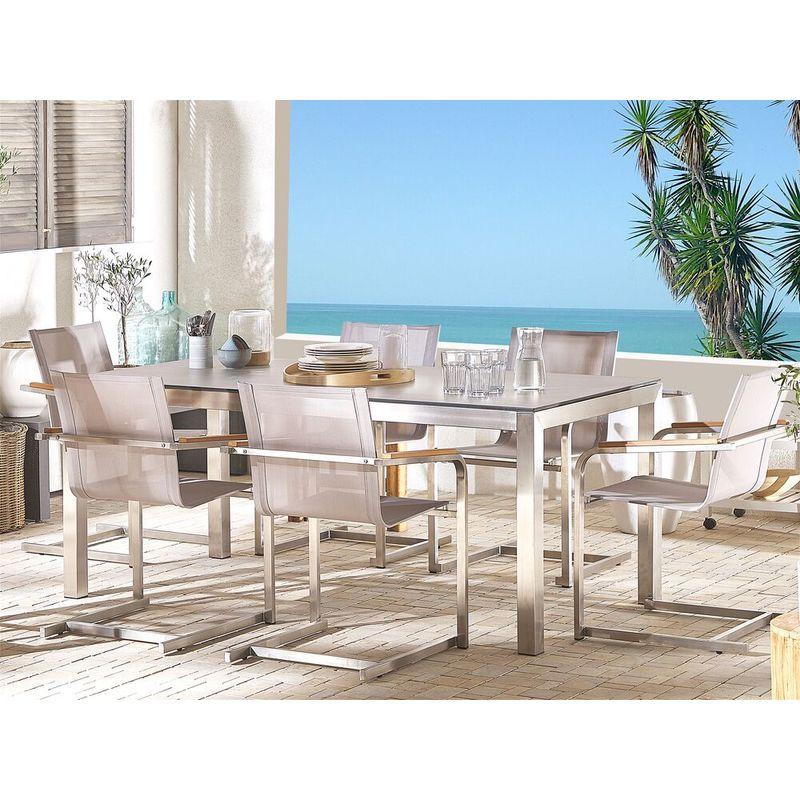 Set da giardino moderno con piano effetto legno e 6 sedie a sbalzo - Set da pranzo moderno con spazio sufficiente per un massimo di 6 persone. - Tutti i telai sono realizzati in acciaio inossidabile spazzolato color argento. - Impressionanti sedie a sbalzo realizzate con il miglior acciaio inossidabile e fibre sintetiche di facile manutenzione. - Piano del tavolo in HPL in un nobile aspetto di legno, abbinato alle sedie in materiale sintetico in color beige. - Ideale per ogni moderno spazio interno ed esterno. Dettagli: Tipo: Set da pranzo per 6 persone Colore: bianco Materiale primario: vetro Materiale secondario: legno plastico, poliestere Montaggio: da assemblare parzialmente Posti a sedere per: 6 persone Punti di forza: Comodi e ampi poggiabraccia, Gommini protettivi sotto alle gambe, Superficie antigraffio, Resistenza UV 6 (ISO 105-B02), Facile da riporre, grazie alla possibilità di impilarla, Base stabile e durevole Dimensioni: Peso: 108 kg Sedia/poltrona: 56x55x85 cm Tavolo:...Per saperne di più