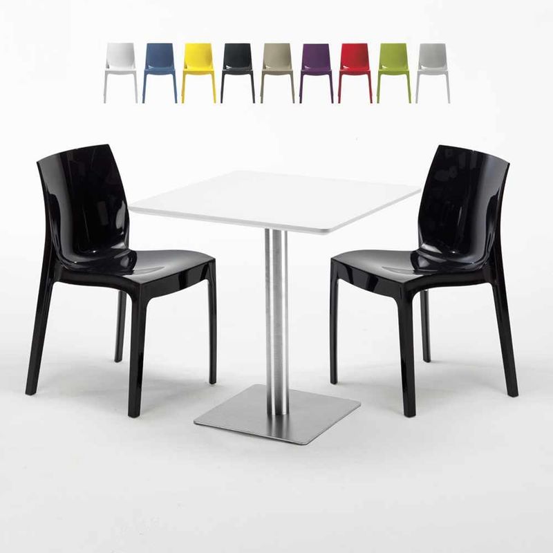 Tavolino Quadrato Bianco 70x70 cm con Base in Acciaio e 2 Sedie Colorate Ice Strawberry | Nero - GRAND SOLEIL