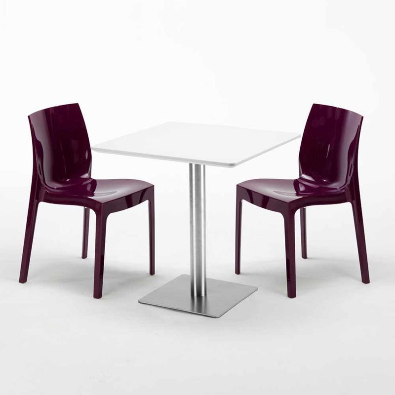 Tavolino Quadrato Bianco 70x70 cm con Base in Acciaio e 2 Sedie Colorate Ice Strawberry | Viola - GRAND SOLEIL