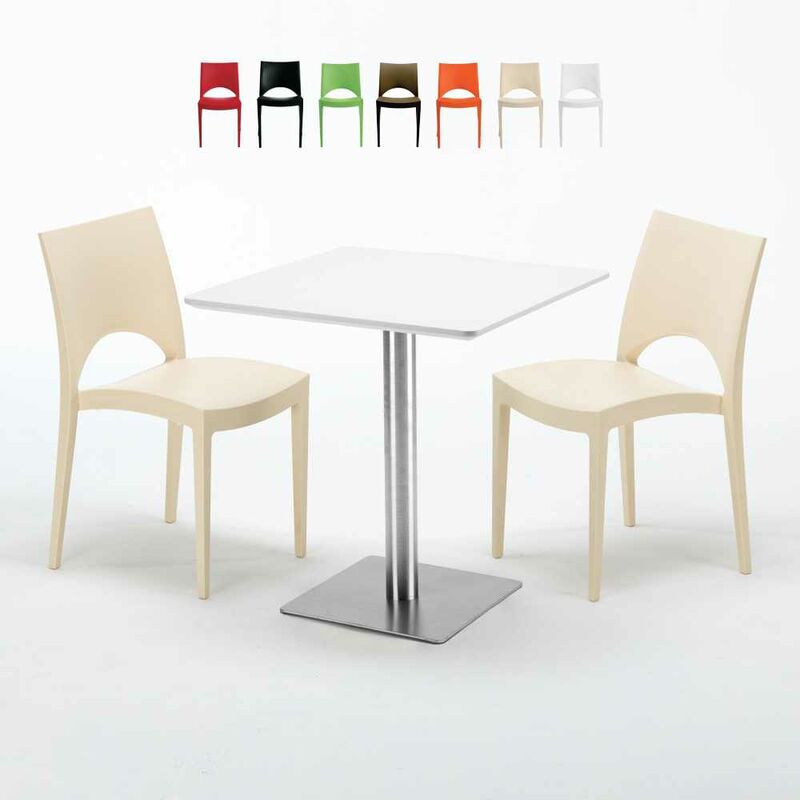 Tavolino Quadrato Bianco 70x70 cm con Base in Acciaio e 2 Sedie Colorate Paris Strawberry | Beige - GRAND SOLEIL