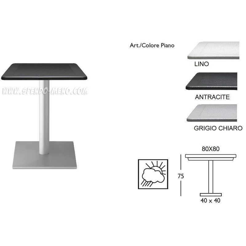 Tavolo completo Dodo composto da: Piano in polipropilene 80x80 cm con parabola sottopiano adatto per l'interno e per l'esterno, colore LINO Basamento tavolo Dodo h 75 cm: colonna tonda; base quadrata 40x40 cm. Colore: Colonna ALLUMINIO ANODIZZATO 75 mm; Finitura base GHISA VERNICIATA ARGENTO MADE IN ITALY - SPEDIZIONE GRATUITA ITALIA...Per saperne di più