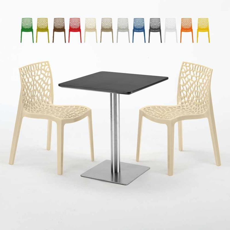 Tavolo Quadrato 60x60 cm Base in Acciaio e Top Nero con 2 Sedie Colorate Gruvyer Pistachio | Beige - GRAND SOLEIL