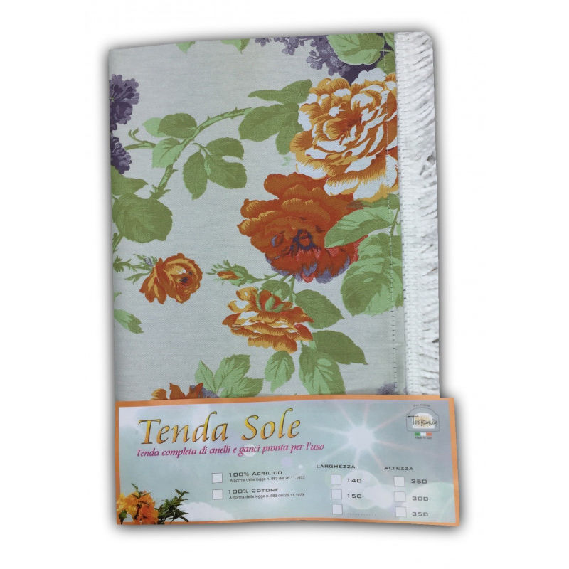 TENDA SOLE ' FIORE BIANCO ' CONFEZIONATA GIÀ PRONTA PER L'USO REALIZZATA IN TESSUTO INDISTRUTTIBILE DI COTONE. RIFINITA NELLA PARTE SUPERIORE CON PUNTINA E OCCHIELLI IN ACCIAIO MENTRE NEI LATI ORLO SEMPLICE E NELLA PARTE INFERIORE FRANGIA ABBINATA. È DOTATA DI GANCI IN PLASTICA CHE AGGANCIATI AGLI OCCHIELLI IN ACCIAIO DELLA TENDA GLI PERMETTONO DI ESSERE MONTATA SU QUALSIASI TIPO DI BASTONE. LA TENDA È STAMPATA CON COLORI SOLIDI SU UN LATO, MENTRE DALL'ALTRO LATO È IN TINTA UNITA VERDE. È IN TESSUTO DI COTONE TWILL CHE RESISTE AD ALTE TEMPERATURE ED HA UNA DURATA DI PARECCHI ANNI. -tessuto....................................................COTONE -funzione tessuto...................................COPRENTE -composizione tessuto.....................100% COTONE -finitura superiore.................OCCHIELLI IN ACCAIO -finitura inferiore.......................................FRANGIA -colore.........................................................BIANCO...Per saperne di più